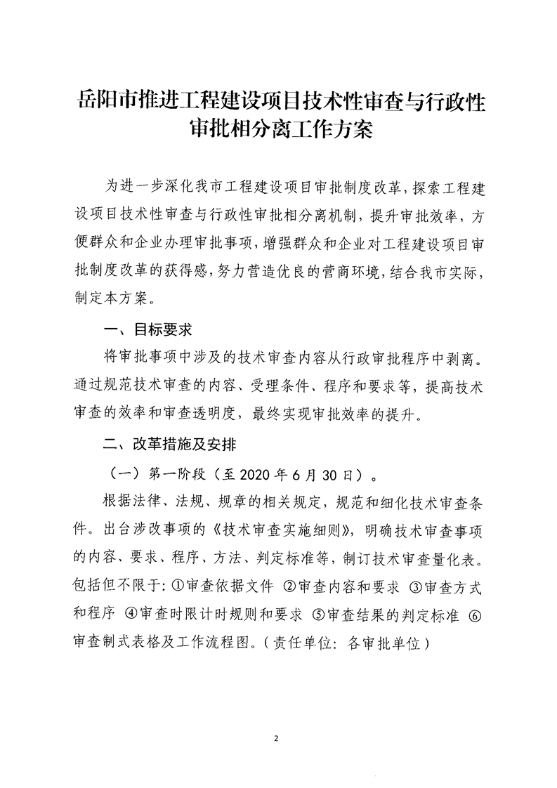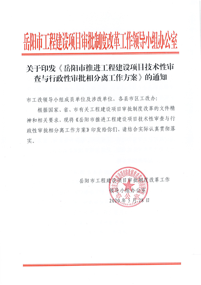 省工改办关于印发《岳阳市推进工程建设项目技术性审查与行政性审查相分离工作方案》的通知