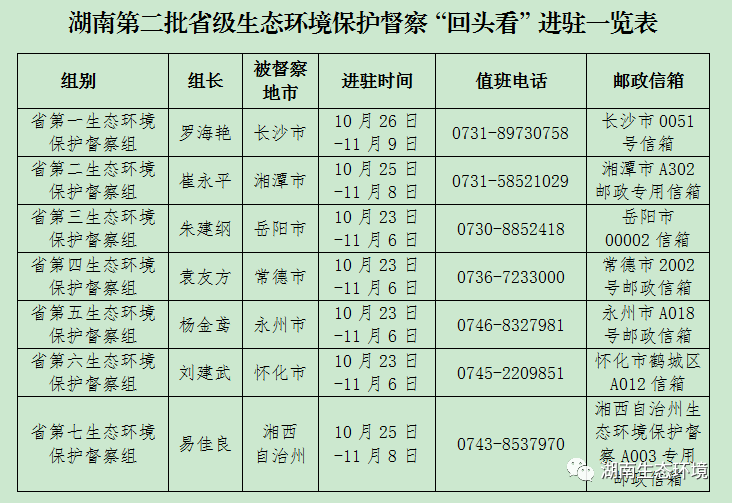 根据安排,湖南第二批省级生态环境保护督察“回头看”进驻时间约为15天。进驻期间,各督察组分别设立专门值班电话和邮政信箱(详见附表),受理被督察对象生态环境保护方面的来信来电举报,受理举报电话时间为每天8:00-18:00。