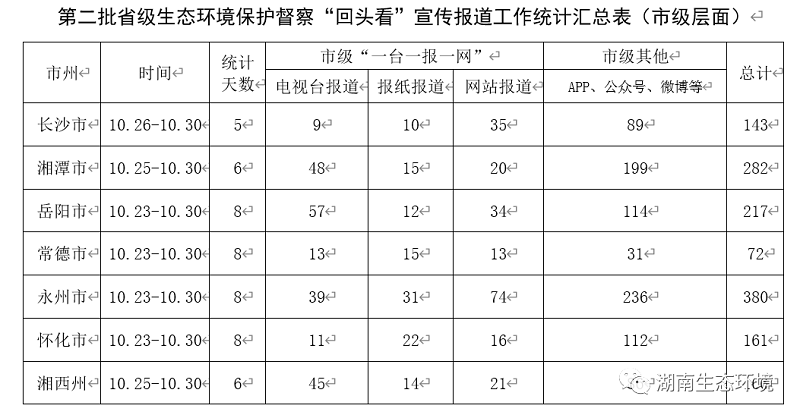 10月23日—26日,第二批7个省级生态环境保护督察组分别进驻相关市州开展督察进驻工作。自督察进驻以来,7市州利用“一台一报一网”(“一台”即市级广播电视台,“一报”即市级党报,“一网”即市级政府网站)以及APP、市新闻网、部门官网、微信公众号、微博等方式宣传报道和公开“回头看”督察及整改工作情况。截至10月30日,7个市州与督察相关的宣传报道总量达1421条,平均每个市州每天近30条。其中,永州市工作力度最大,除市级电视台外,其他各媒体宣传报道数量均居7个市州之首。