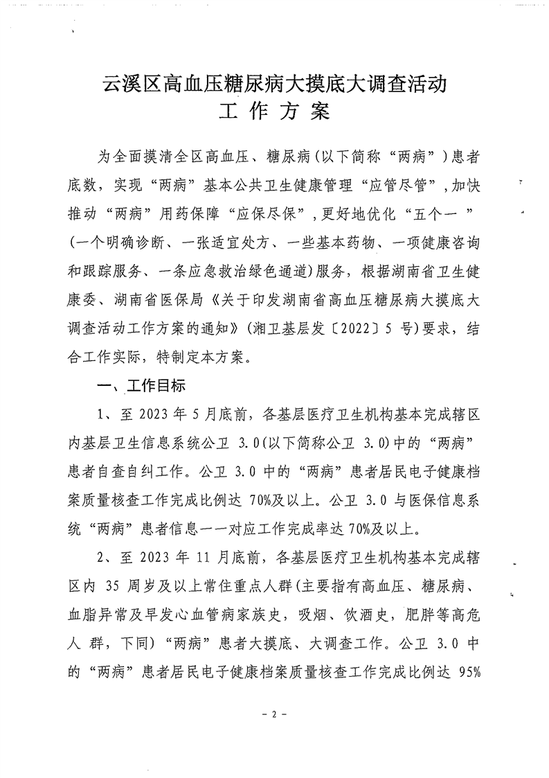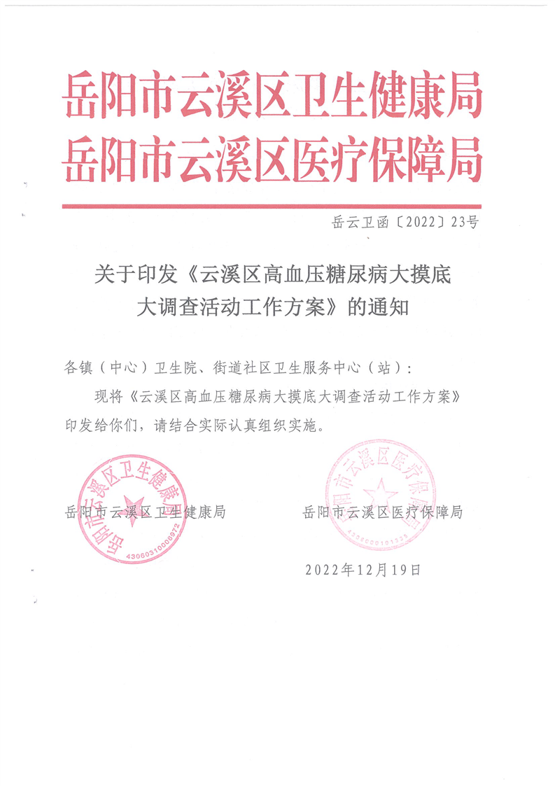 关于印发《云溪区高血压糖尿病大摸底大调查活动工作方案》的通知