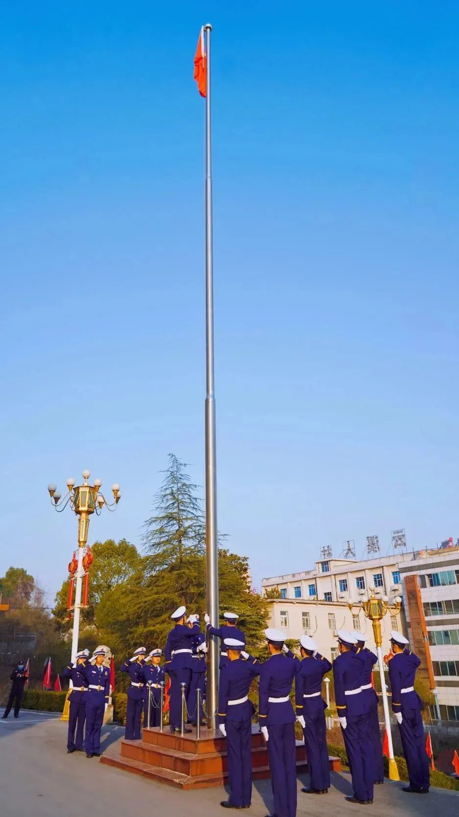 现场全体人员面向国旗,奏唱国歌,目光追随,肃立致敬