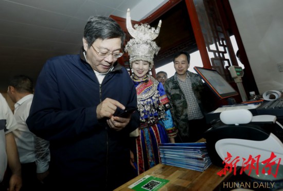27日下午,杜家毫在南山国家公园考察时,通过扫码支付购买当地特色农产品。以上图片均为湖南日报·华声在线记者 罗新国 摄