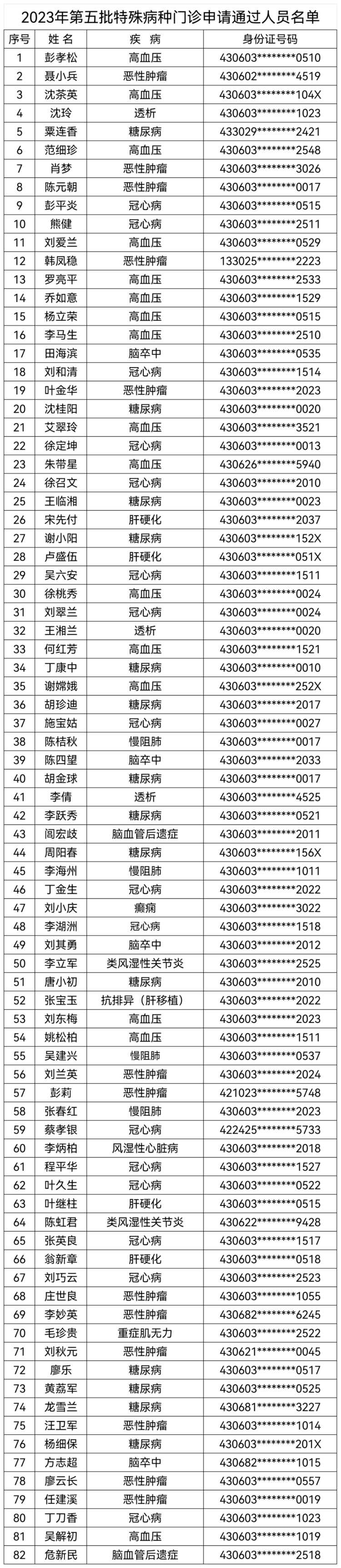 根据《岳阳市云溪区医疗保障局关于印发<城乡居民基本医疗保险门诊统筹实施细则>的通知》(岳云医保发〔2019〕2号)和《岳阳市人力资源和社会保障局关于进一步规范市本级基本医疗保险特殊病种门诊及家庭病床管理的通知》(岳人社发〔2015〕82号)文件精神,经参保人员申报、政务中心医保窗口受理、专家评鉴、区医保事务中心确认,现将2023年第四批申请鉴定通过人员名单进行公示。以下82人符合办理特殊病种相关条件,不符合办理条件26人。