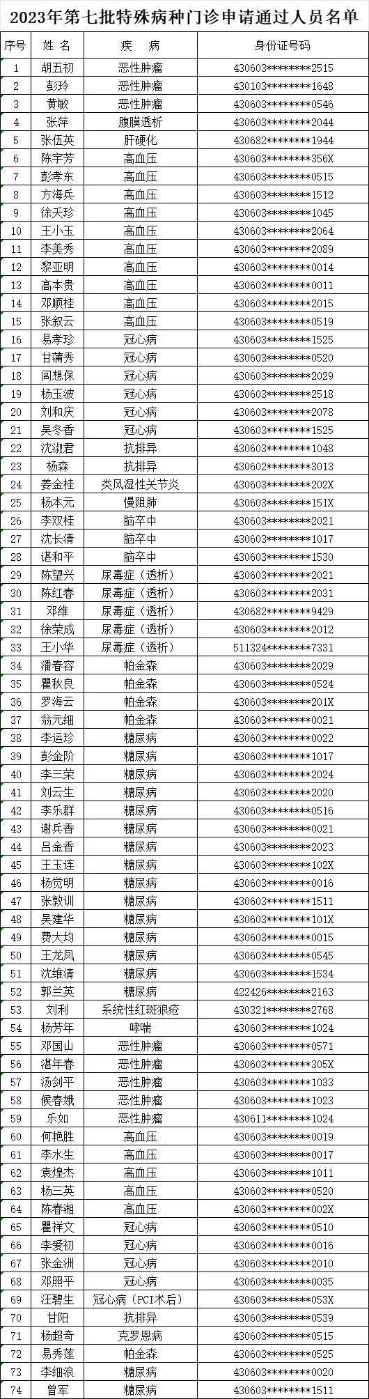 根据《岳阳市云溪区医疗保障局关于印发<城乡居民基本医疗保险门诊统筹实施细则>的通知》(岳云医保发〔2019〕2号)和《岳阳市人力资源和社会保障局关于进一步规范市本级基本医疗保险特殊病种门诊及家庭病床管理的通知》(岳人社发〔2015〕82号)文件精神,经参保人员申报、政务中心医保窗口受理、专家评鉴、区医保事务中心确认,现将2023年第七批申请鉴定通过人员名单进行公示。本批次共收到申报92人,其中74人符合办理特殊病种相关条件,不符合办理条件18人。