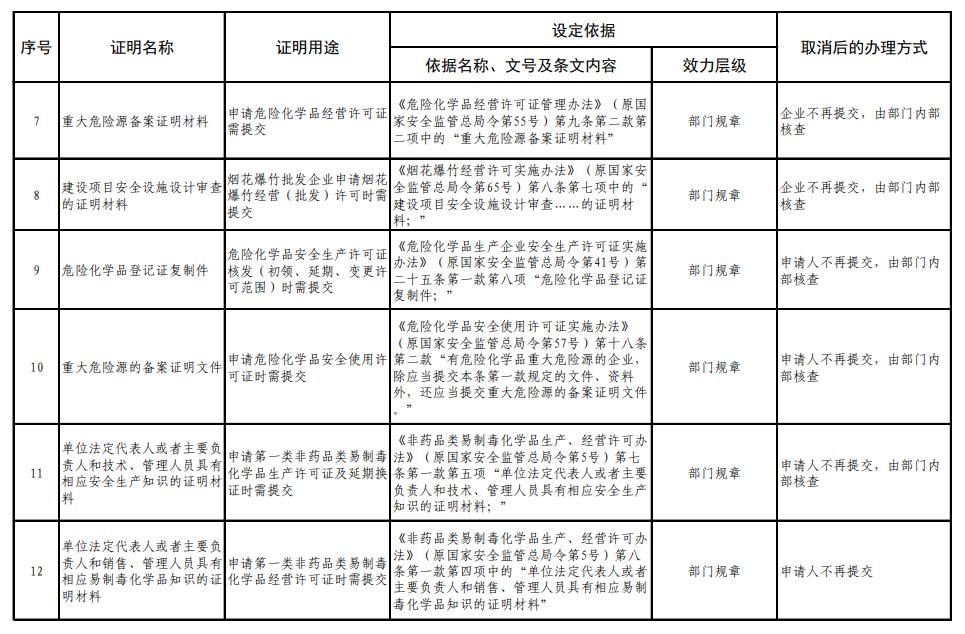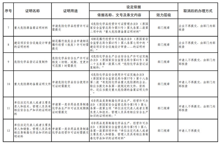 为贯彻落实党中央、国务院关于减证便民、优化服务的部署要求,根据《国务院办公厅关于做好证明事项清理工作的通知》(国办发〔2018〕47号)精神,现将应急管理部第二批取消的15项由部门规章设定的证明事项、4项由规范性文件设定的证明事项(见附件)予以公布,自公告之日起停止执行。证明事项涉及的部门规章和规范性文件按程序修改后另行公布。