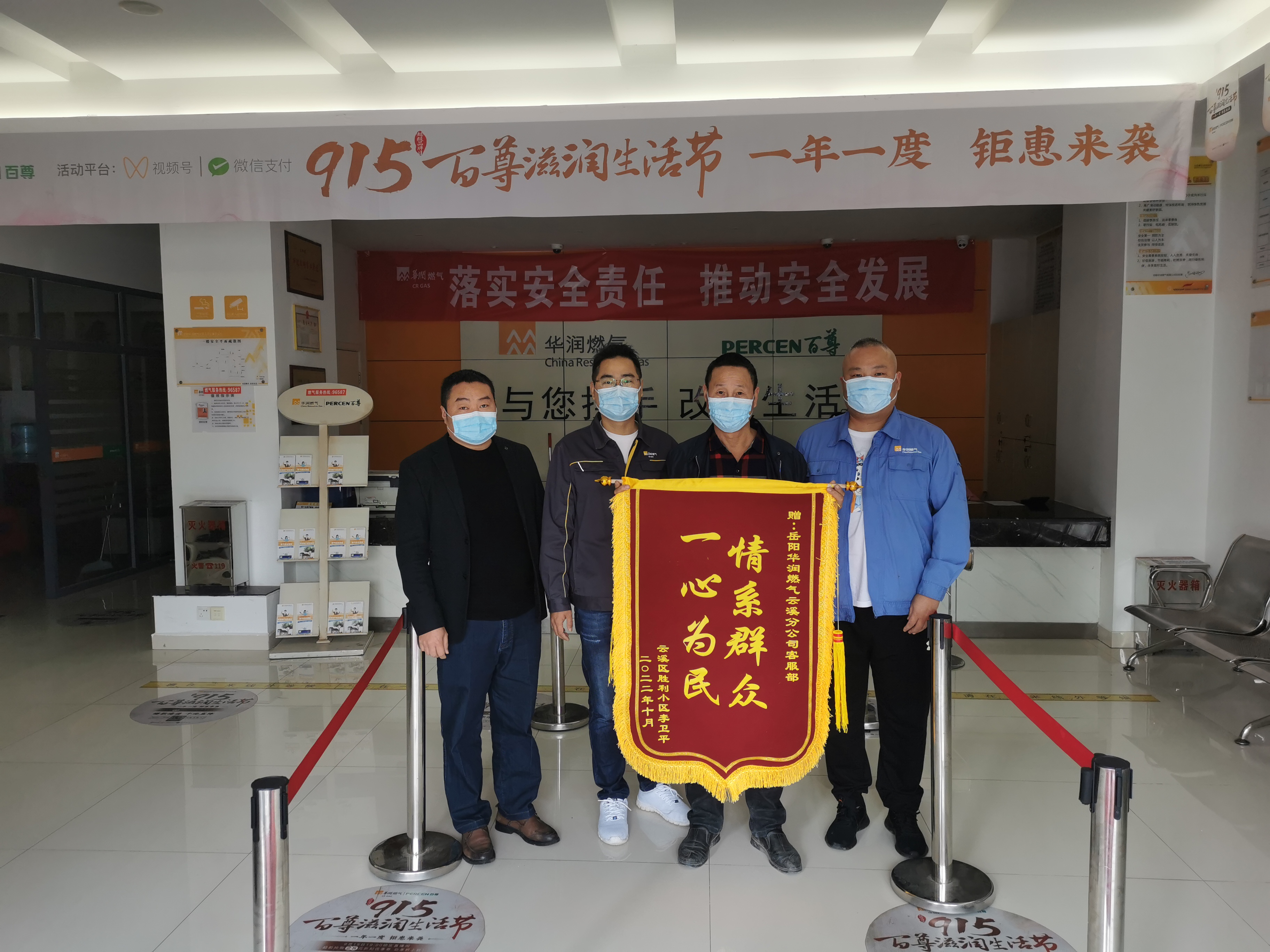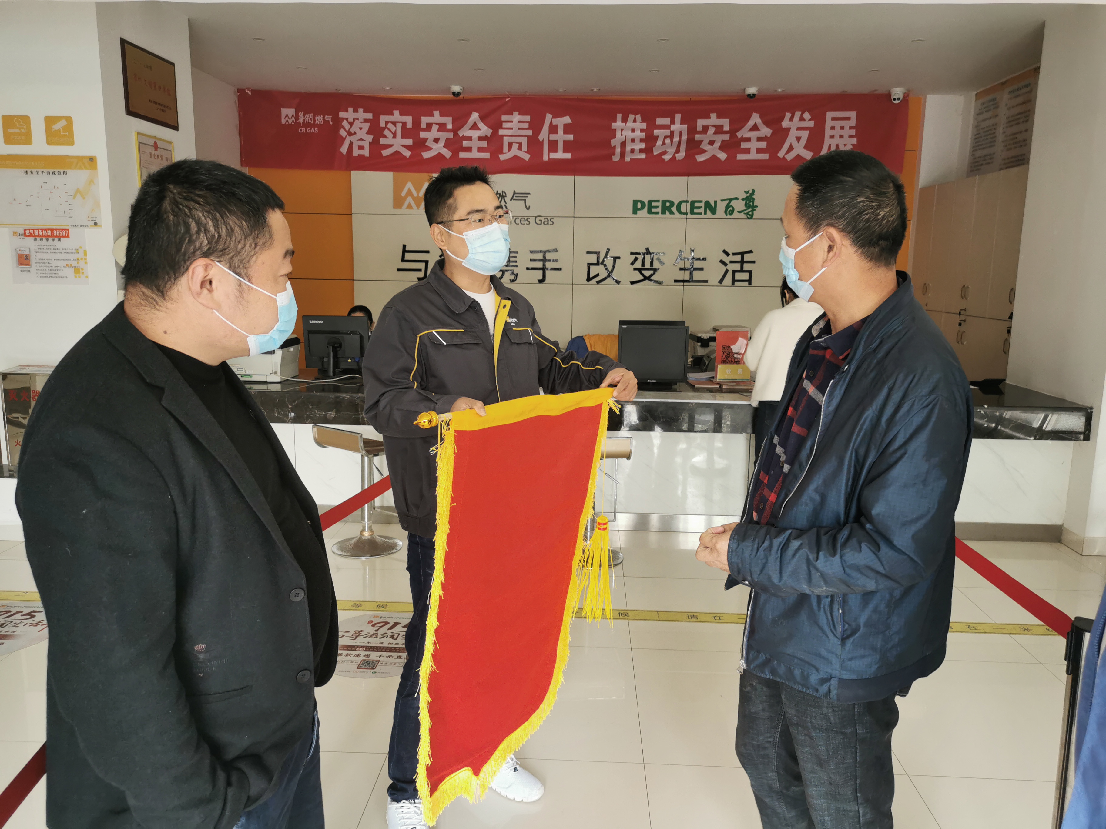 11月1日上午,云溪公司客服中心一早迎来一位特殊的用户,他一手握着锦旗一边对着客服部同事连声道谢,恰巧引来云溪公司总经理周伟宏和副总经理方琪的注意。在互相交谈下得知原来这是一位退伍军人,同时也是一位低保困难户。近日,我司安检人员在其家中进行安全检查时发现家中的燃气软管存在较大的安全隐患,经了解后考虑到用户没有其他经济来源,生活困难,决定采用最优惠的方案更换金属波纹,最大程度上解决了安全隐患,为用户营造一个安全的用气环境。