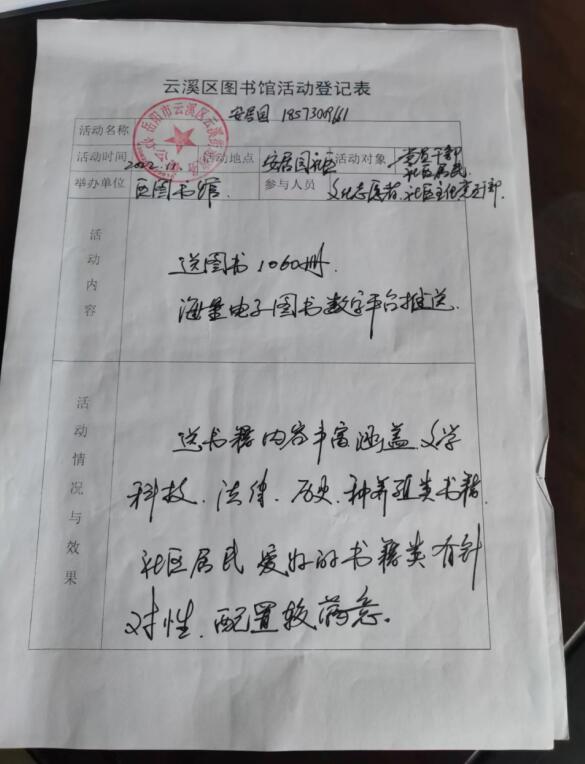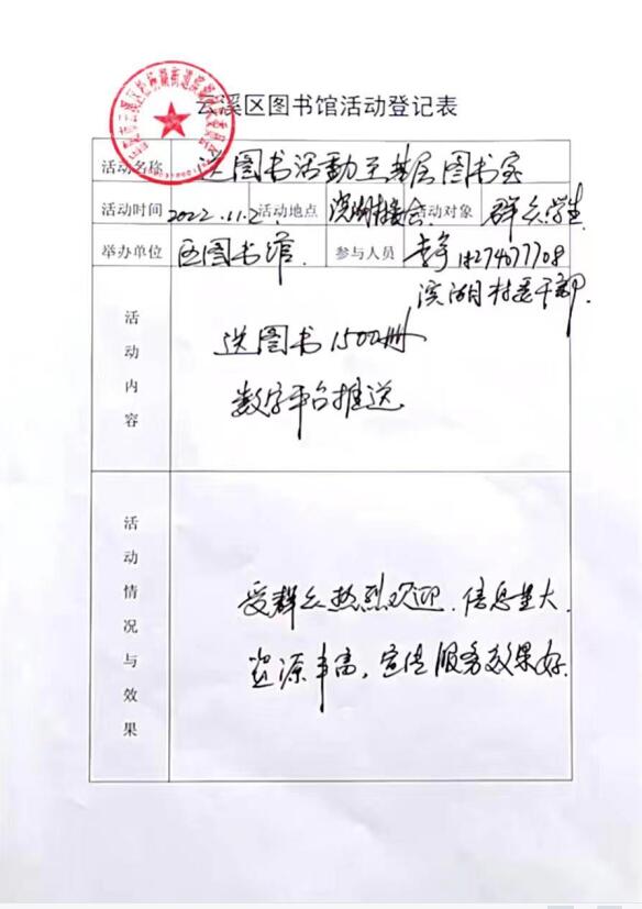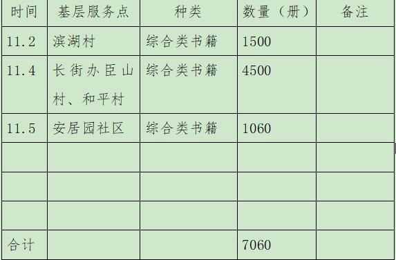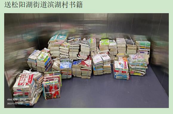 2022年11月,图书馆送出综合类书籍1500册于滨湖村,4500册于长炼办、臣山村、 和平村;1060册于安居园社区,合计7060册书籍。为丰富群众文化生活提供了很好的条件。