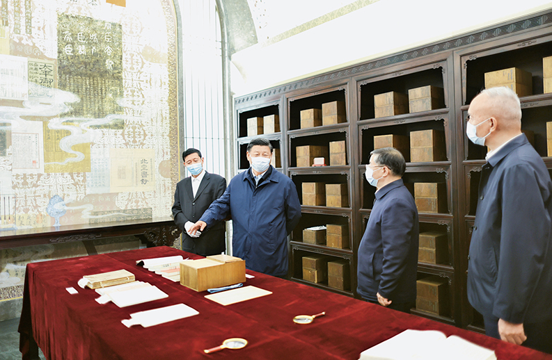 2023年6月2日,中共中央总书记、国家主席、中央军委主席习近平在北京出席文化传承发展座谈会并发表重要讲话。这是座谈会前,习近平1日下午在中国国家版本馆考察时,在兰台洞库了解馆藏精品版本保存情况。 新华社记者 鞠鹏/摄