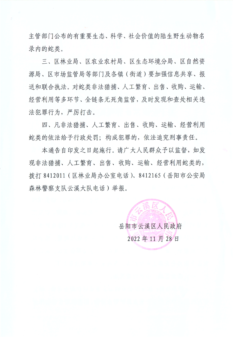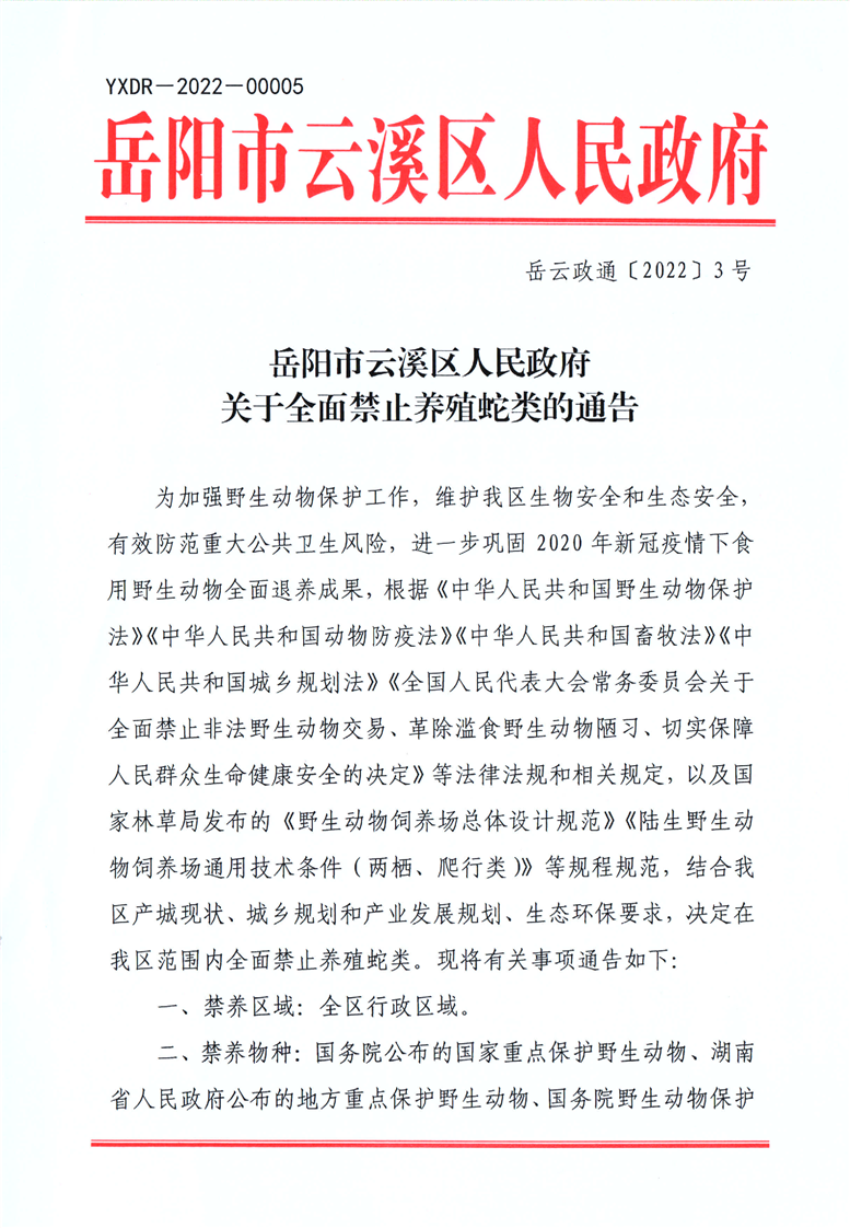 区政府关于全面禁止养殖蛇类的通告