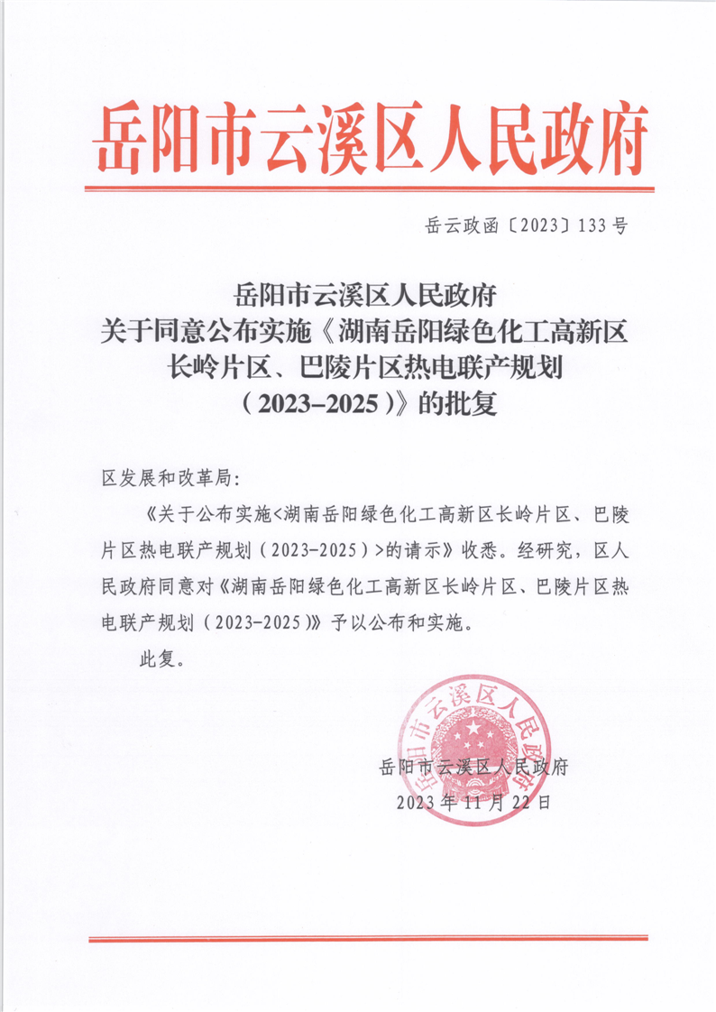 区政府关于同意公布实施《湖南岳阳绿色化工高新区长岭片区、巴陵片区热电联产规划(2023-2025)》的批复