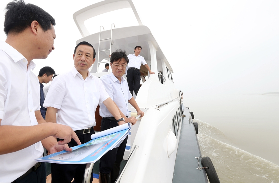 2018年9月18日,省委副书记、省长许达哲乘船沿湘江入洞庭湖,巡视河况湖况,实地考察湖区矮围网围整治工作。