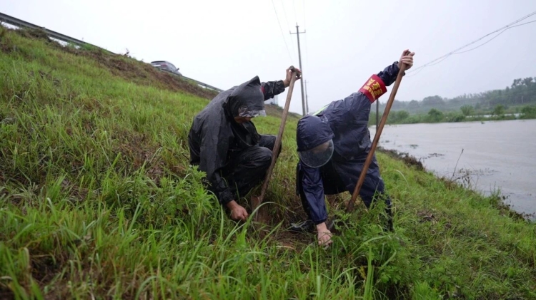 高高飘扬的猎猎党旗下,是500米一设的防汛棚。75岁的陆城镇白泥湖村民文应云刚结束完一轮巡堤。“文嗲主动提出要上堤值守的精神值得我们学习!”一旁交接的村干部边递水边说。“我在江边工作多年,熟悉水,我来是应该的!”文应云说。