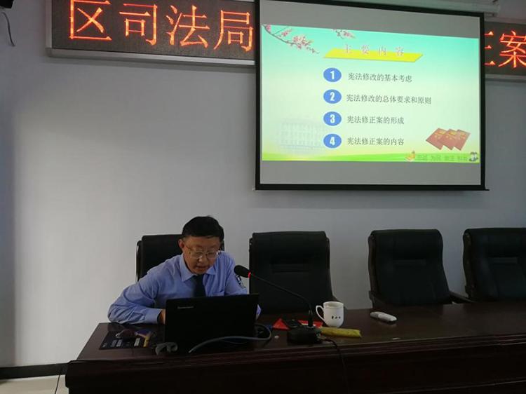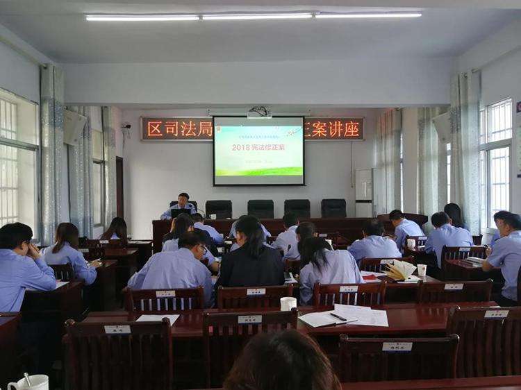 为认真贯彻落实省委、市委关于学习宣传宪法的有关部署和要求,进一步领会和把握宪法修正案的核心要义和精神实质,更好的发挥宪法在推进全面依法治区和法治云溪建设中的作用,5月7上午,岳阳市云溪司法局举办宪法修正案专题讲座,局党组书记、局长李小白对《宪法修正案》作了专题解读,区司法局全体工作人员参加了学习。