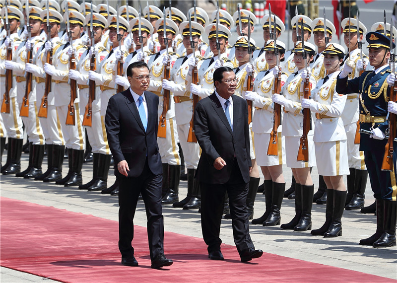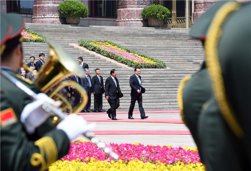 国务院总理李克强5月16日上午在人民大会堂东门外广场举行仪式,欢迎柬埔寨首相洪森来华进行正式访问并出席“一带一路”国际合作高峰论坛。