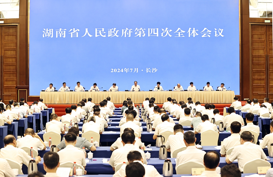 ?7月23日下午,省政府召开第四次全体会议,总结上半年经济工作,分析当前形势,部署下半年工作任务。省委副书记、省长毛伟明强调,要深入贯彻党的二十届三中全会精神、习近平总书记考察湖南重要讲话和指示精神,按照省委工作要求,大力抓好“十个统筹”,持续推进“八大行动”,全力推动经济持续回升向好,唱响光明论、吹响冲锋号,坚定不移实现全年经济社会发展目标。