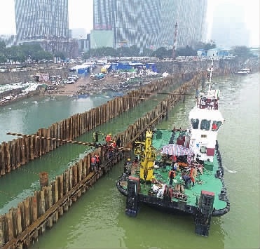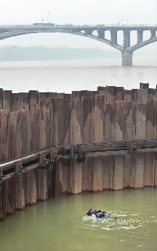 罗栩介绍,去年10月25日该项目正式开工,11月底全线6个潜水班组开始进驻工地,每个班组5人,其中潜水员3人、岸上辅助人员2人。“潜水员班组负责双钢围堰的止水作业,形象地说,也就是通过‘查漏补缺’,让双钢围堰‘滴水不漏’。” 据分管该项目围堰施工的周跃林说,项目在解放路高排、五一路高排、长沙轮渡码头至战备码头堤防、战备码头、老槺凼共有5个钢板围堰,全长约1公里。