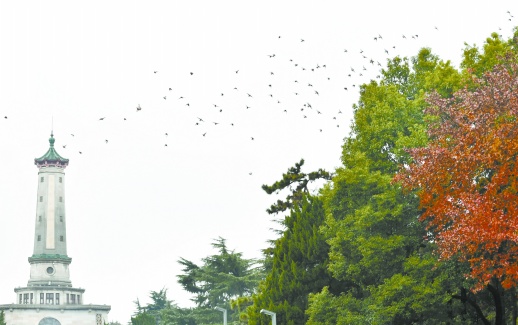 1月4日,湖南烈士公园,椋鸟成群结队在树枝间飞来飞去。每到冬季,在长沙的各大园林及树木茂盛的地方,常常可以看到成群的鸟结伴飞翔觅食,给冬日的星城增加了一道亮丽的生态美景。