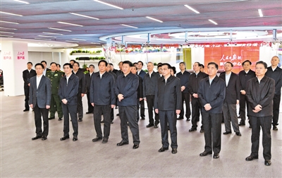 参观结束后,习近平等来到人民网全媒体播控中心,人民网总裁叶蓁蓁就媒体融合发展作了讲解,大家进行了讨论。