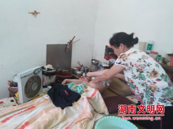 李晓辉给丈夫擦洗身体。图片来源:湖南文明网