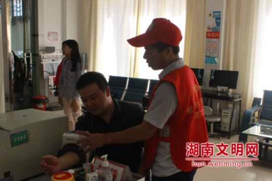 何志龙(右一)在为献血志愿者测量血压。图片来源:湖南文明网