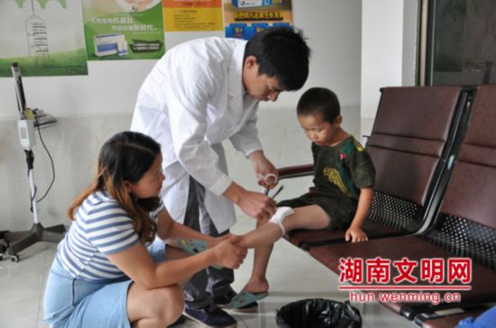 雷国友(中)为患者包扎伤口。图片来源:湖南文明网