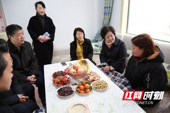 财政部副部长程丽华(右二)在平江县城关镇洪家塅易地扶贫搬迁集中安置点看望慰问贫困户。