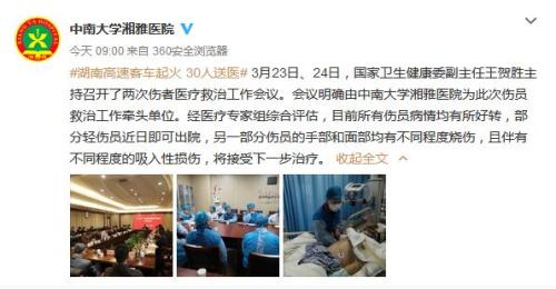 3月22日,湖南高速一旅游大巴起火致26死28伤。25日,湖南省中南大学湘雅医院通过官方微博发布消息称,所有伤员病情均有所好转,部分轻伤员近日即可出院,另一部分伤员的手部和面部均有不同程度烧伤,且伴有不同程度的吸入性损伤,将接受下一步治疗。