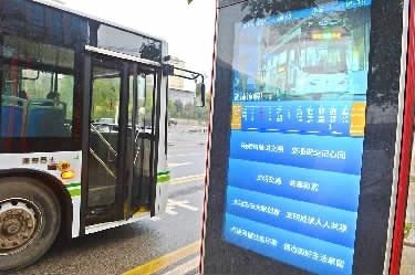 3月26日,湖南湘江新区智慧公交示范线中大检测公交站,新安装的站内电子显示屏通过5G信号显示公交线路停靠站况等便民信息。日前,湖南湘江新区智慧公交测试区内及智慧公交示范线7.8公里开放道路实现5G信号全覆盖,确保了车路及车车之间“交流”不延时。
