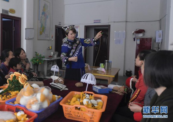 湘西龙山姑娘谭艳林(中)在培训公司员工(2018年10月30日摄)。谭艳林在龙山县城创立了“惹巴妹”手工织品有限公司,将土家族特色编织手法与现代设计相结合,编织出的产品受到消费者喜爱。新华社发(陈泽国 摄)