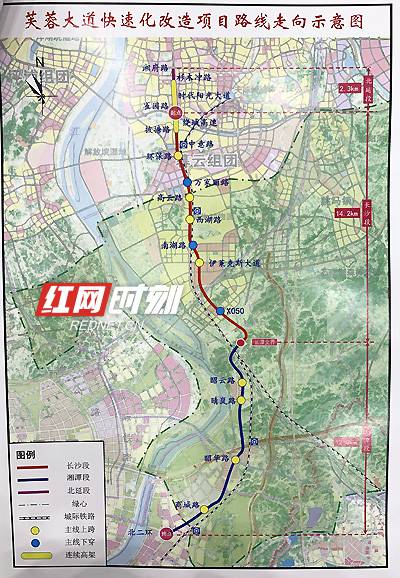 其中,芙蓉大道快速化改造,项目起于长沙绕城高速北侧的雀园路口,止于湘潭市北二环交叉口,全长26.2公里。改造完成后,共消除26个灯控路,通行时间预计由原来的40分钟减少为22分钟。