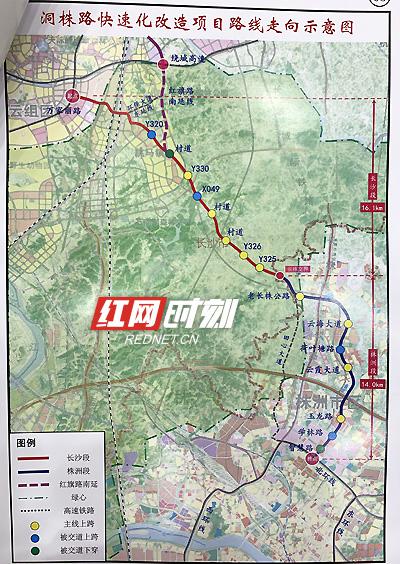 洞株路快速化改造,项目起于长沙市万家丽路与环保大道交叉口,止于株洲市北环线交叉口,全长30.1公里。改造完成后,共消除22个灯控路、6个无信控路口的影响,通行时间预计由原来的45分钟减少为28分钟。此外,长沙市红旗路南延工程、环保大道东延工程实施后,洞株路可通过以上两个工程进一步快速接入红旗路和万家丽路,全面对接长沙骨架路网。