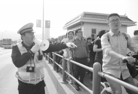 5月2日16点左右,橘子洲地铁站和公交车站更是挤满了人,排着的长队绕着围栏转了好几个弯,足有十余米长。因为坐车、坐地铁出橘子洲的人太多,不少人选择走路上桥,到了河西或者五一广场附近,再搭乘别的交通工具离开。可不曾想,上下桥的两个旋转楼梯都因为人流太多,人被堵在了楼梯上,几乎是以“龟速”在挪动,半天都没动一步。