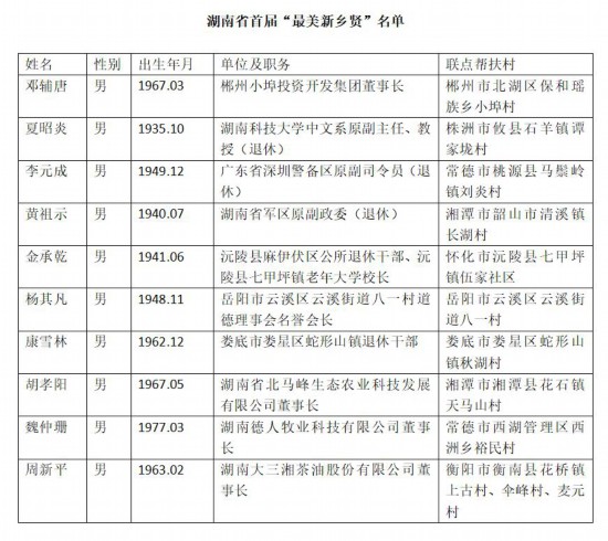 记者昨日获悉,由省农业农村厅、省文明办、省文化和旅游厅联合举办的湖南省首届“最美新乡贤”评选结果揭晓,邓辅唐、夏昭炎、李元成、黄祖示、金承乾、杨其凡、康雪林、胡孝阳、魏仲珊、周新平等10人入选。