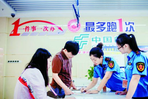 7月1日,宁远县市监局窗口,工作人员在受理企业申办登记。最近,该县推行“一件事一次办”改革,实现企业和群众办事线上“一次登录、一网通办”,线下“只进一扇门”。黄建军 摄
