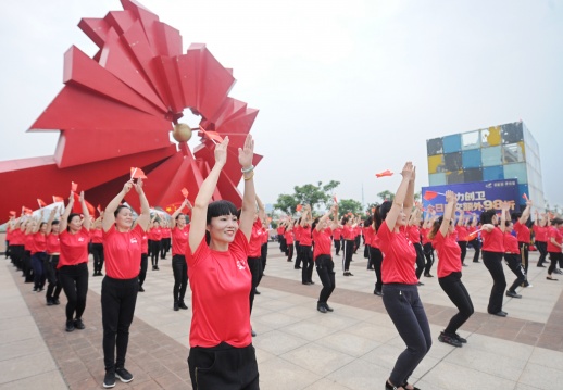 5月12日,湘潭市河东湘江风光带,广场舞爱好者手舞国旗,翩翩起舞。方阳 摄
