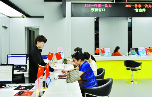 9月18日,蓝山县政务服务中心“一件事一次办”窗口,工作人员指导办事群众填写资料。 杨雄春 摄