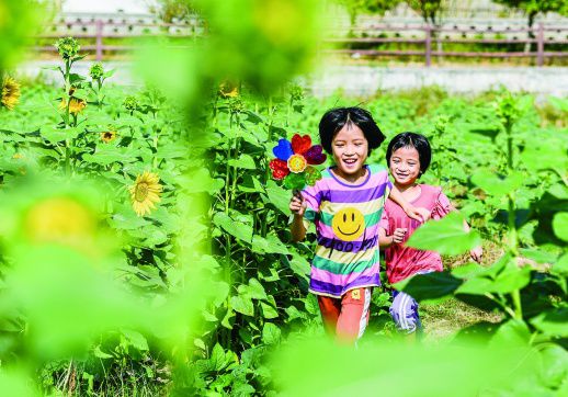 10月5日,道县祥霖铺镇两河口村,小朋友在向日葵花海里撒欢。(蒋克青 陈旺胜 摄影报道)