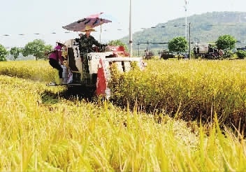 10月5日,嘉禾县普满乡雷家村,来自河南省驻马店市新蔡县的农机人员在为当地村民收割晚稻。国庆假期,河南、安徽、四川等地的农机合作社人员纷纷来到湘南各地开展跨省作业。(黄春涛 摄)