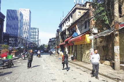 10月28日,西长街西侧是光鲜亮丽的万达写字楼,东侧是杂乱颓败的老旧门店,对比起来显得十分落寞。记者 石芳宇 摄