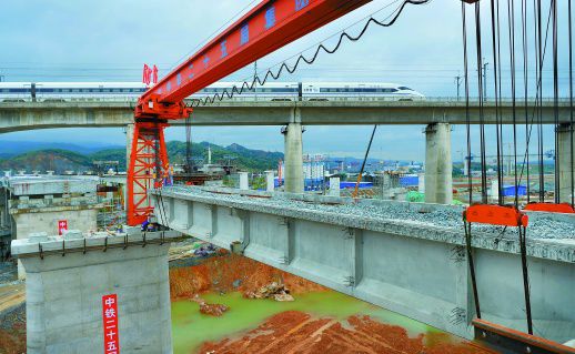 11月18日,怀化市鹤城区延江大道特大桥施工现场,中铁二十五局施工人员在进行首片T梁架设作业,标志着渝怀铁路增建二线引入怀化枢纽工程进入铺架施工阶段。该枢纽工程是渝怀铁路扩能改造工程,客货共线,设计时速120公里,为国家中长期铁路网规划的重要建设项目。 (记者 李健 通讯员 唐国亮 摄影报道)