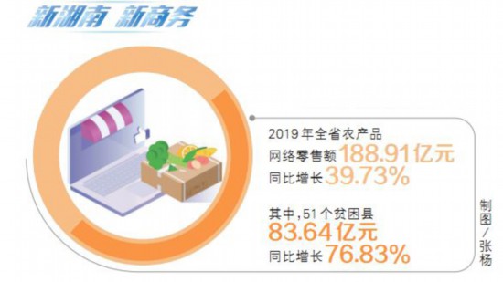 2019年,我省继续大力实施电商扶贫,电商促进“农产品上行”成效显著。通过打造网销“一县一品”品牌、设立“电商扶贫特产专区”、推广“湖南电商扶贫小店”,同时深入推进与电商大平台的合作以及直播电商发展,我省重点聚焦农产品上行,助推贫困地区产品销售。2019年全省农产品网络零售额188.91亿元,同比增长39.73%;其中,51个贫困县83.64亿元,同比增长76.83%。