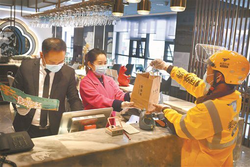 云吃饭 3月19日,长沙市雨花区湘府东路食鉴家,配送员在取餐。受疫情影响,实体餐饮企业遭遇销售“瓶颈”。不少企业通过线上、外卖服务,实现了销售增长。