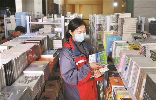 云购书 3月20日,湖南新华书店集团“阅达书城”,工作人员杨燕在图书仓库里拣书。该书城通过线上下单,结合同城配送等服务,推动传统实体门店由地面营销向线上线下一体化运营转型升级。今年以来,自营销售额同比增长163%。