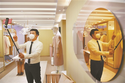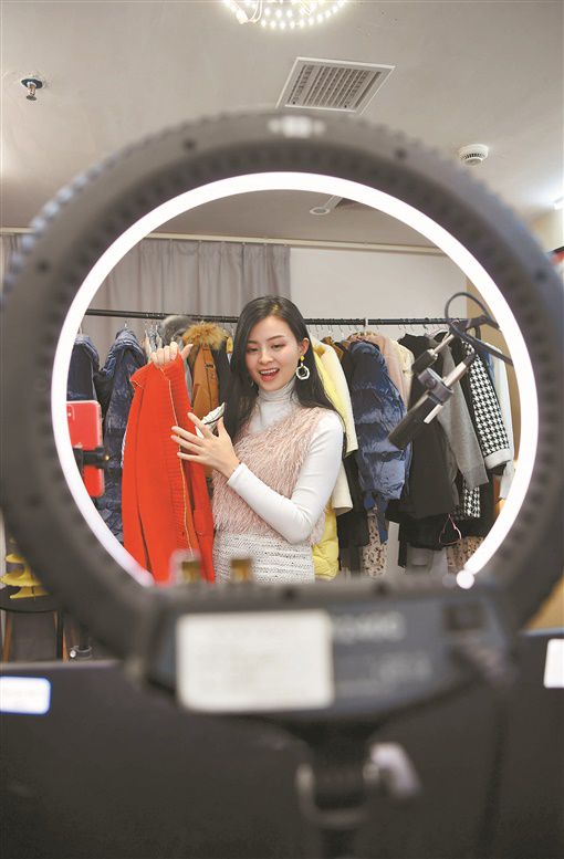 云销售 3月19日,长沙市影娱文化,“95后”朱霞在蘑菇街电商直播带货卖衣服。疫情期间,实体店铺实行主播带货销售、顾客线上互动购物,催生了体验感较强的“云销售”。