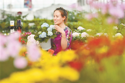 云卖花 3月21日,长沙市岳麓区莲花镇爱格花卉基地,工作人员袁巧花通过网络直播卖花。目前,该基地复工开业约700亩,通过直播“带货”等方式提高花卉及苗木销量。图/文 湖南日报首席记者 郭立亮