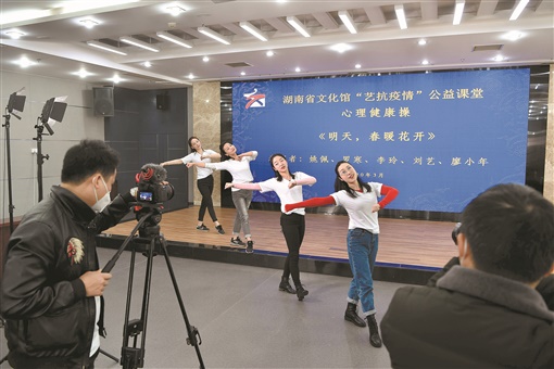 云文化 3月20日,志愿者在录制防疫健康操。自2月2日以来,湖南省文化馆在湖南省数字文化馆平台开设“艺抗疫情”公益课堂,发布作品680多个,让人们不出门就可以学习舞蹈、声乐和书画等文化内容。