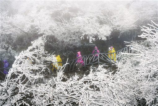 3月28日,游客在雾凇林中感受着春季赏冬景的惊喜。受寒潮影响,当天凌晨,海拔1500多米的张家界天门山国家森林公园迎来降雪,景区一派银装素裹,春季再现冰雪美景。覃少波 丁云娟 摄影报道