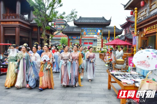 5月1日至3日,长沙方特东方神画推出“华裳盛典”,图为游客着华服逛古风市集。何超 摄