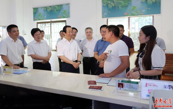 6月20日至21日,省委副书记、省长许达哲深入郴州市宜章县、苏仙区等地调研。图为许达哲在宜章县一六镇政务服务中心,与前来办事的村民交流。赵持摄