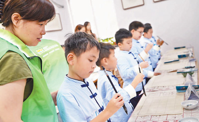 白鹤小学志愿者老师(左一)正在教学生们练习书法。谢再斌 摄